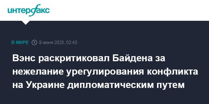 Москва. 9 июня. INTERFAX.RU - Вице-президент США Джей Ди Вэнс раскритиковал администрацию экс-президента Джо Байдена за поддержку конфликта на Украине и нежелание достичь дипломатического урегулирования.