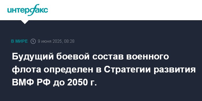 Москва. 9 июня. INTERFAX.RU - Президент России Владимир Путин 30 мая утвердил Стратегию развития ВМФ на период до 2050 года, в документе определен будущий боевой состав флота, его основные задачи в мирное и военное время. Об этом сообщил помощник президента РФ, председатель Морской коллегии России Николай Патрушев.