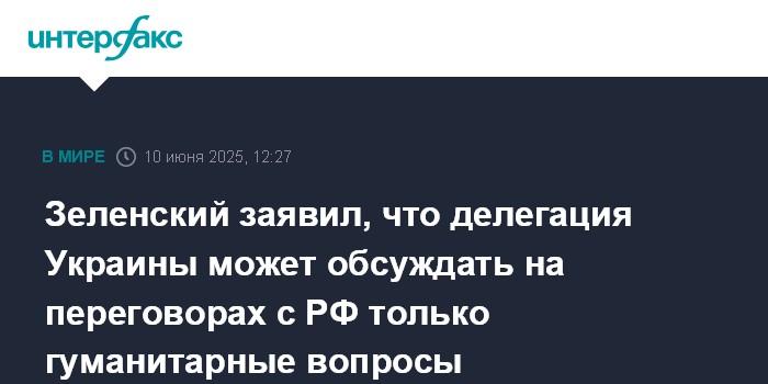 Москва. 10 июня. INTERFAX.RU - Украинская делегация на переговорах с РФ уполномочена обсуждать гуманитарные вопросы на основе украинского меморандума; мандата на обсуждение суверенитета и территориальной целостности Украины у нее нет, заявил президент Владимир Зеленский.