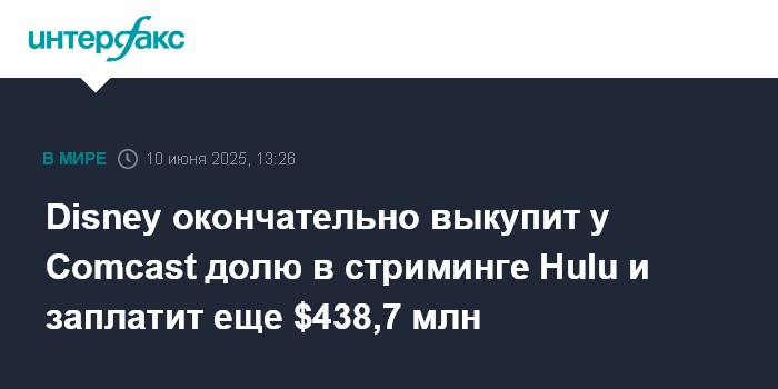 Москва. 10 июня. INTERFAX.RU - Walt Disney Co. достигла соглашения с конкурирующей Comcast Corp. об условиях выкупа у нее 33%-й доли в стриминговом сервисе Hulu.