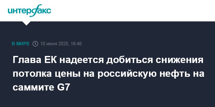 Москва. 10 июня. INTERFAX.RU - Председатель Еврокомиссии Урсула фон дер Ляйен заявила о намерении добиваться снижения потолка цен на российскую нефть на предстоящей встрече G7 в Канаде.