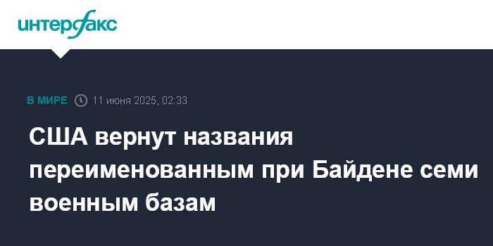 Москва. 11 июня. INTERFAX.RU - Президент США Дональд Трамп во вторник объявил, что Пентагон восстановит названия семи военных баз, которые были переименованы при экс-президенте Джо Байдене.