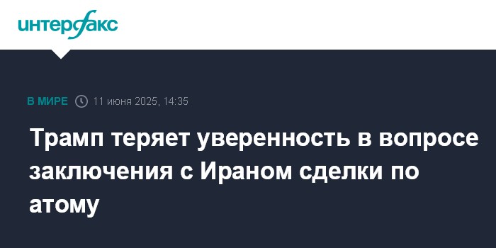 Москва. 11 июня. INTERFAX.RU - Президент США Дональд Трамп заявил, что стал менее оптимистично относиться к возможности заключения с Тегераном соглашения по ядерному вопросу.