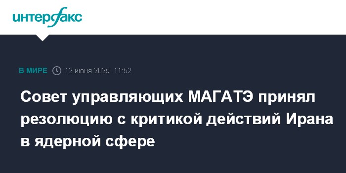Москва. 12 июня. INTERFAX.RU - Совет управляющих МАГАТЭ в четверг одобрил резолюцию, согласно которой Иран не соблюдает свои обязательства в ядерной сфере, сообщает Associated Press (AP) со ссылкой на источники.
