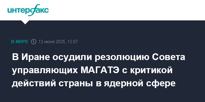 Москва. 12 июня. INTERFAX.RU - Иранский МИД и Организация по атомной энергии Ирана в четверг выступили с осуждением резолюции Совета управляющих МАГАТЭ, согласно которой Тегеран не в полной мере исполняет свои обязательства в ядерной сфере, передает Mehr.