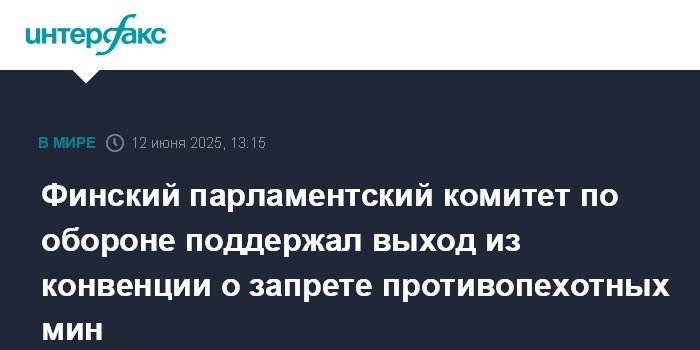 Москва. 12 июня. INTERFAX.RU - В Финляндии парламентский комитет по обороне поддержал выход государства из Оттавской конвенции о запрете применения, накопления запасов, производства и передачи противопехотных мин.