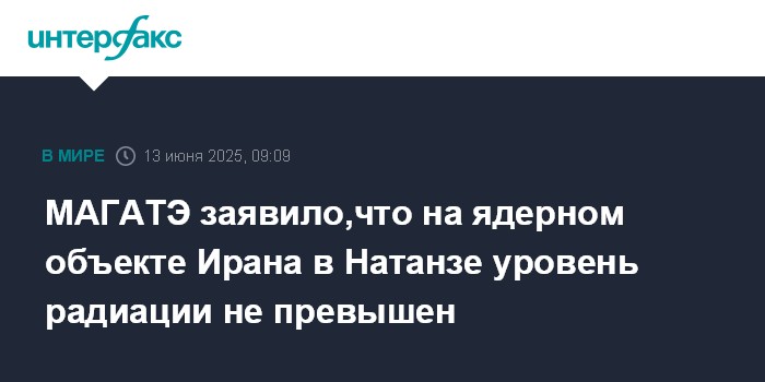 Москва. 13 июня. INTERFAX.RU - Повышения уровня радиации на иранском ядерном объекте по обогащению урана в Натанзе, который был атакован Израилем, не наблюдается, заявило Международное агентство по атомной энергии (МАГАТЭ) со ссылкой на информацию властей Ирана.