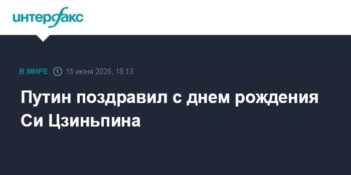 Москва. 15 июня. INTERFAX.RU - Президент РФ Владимир Путин тепло поздравил председателя КНР Си Цзиньпина с днем рождения, сообщил пресс-секретарь российского лидера Дмитрий Песков.