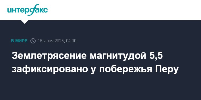 Москва. 16 июня. INTERFAX.RU - Подземный толчок магнитудой 5,5 зафиксирован в акватории Тихого океана у побережья центральной части Перу, сообщает Алтае-Саянский филиал Единой Геофизической службы РАН.