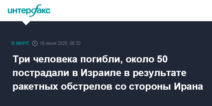 Москва. 16 июня. INTERFAX.RU - Три человека погибли, почти 50 получили ранения в Израиле после ракетных обстрелов со стороны Ирана, сообщают местные СМИ.