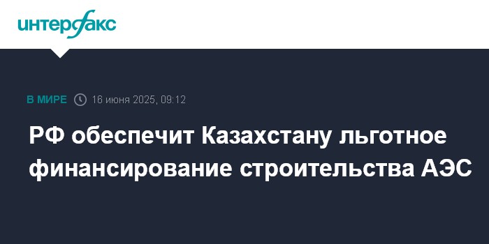 Москва. 16 июня. INTERFAX.RU - РФ предоставит Казахстану экспортное финансирование строительства АЭС на льготных условиях, окончательная стоимость объекта пока не определена, сообщила пресс-служба Агентства республики по атомной энергетике.
