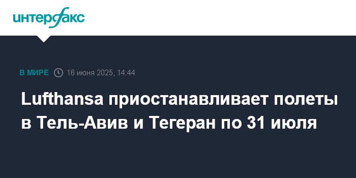 Москва. 16 июня. INTERFAX.RU - Lufthansa приостанавливает полеты в Тель-Авив (Израиль) и Тегеран (Иран) по 31 июля, говорится в сообщении германского авиаперевозчика.