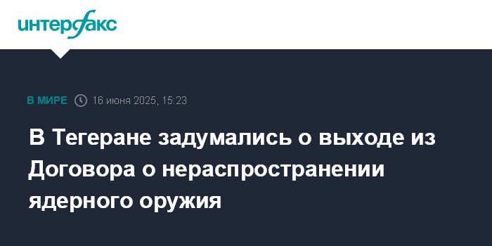 Москва. 16 июня. INTERFAX.RU - Иран рассматривает возможность выхода из Договора о нераспространении ядерного оружия (ДНЯО), сообщила в понедельник The Guardian со ссылкой на пресс-секретаря иранского МИД Эсмаила Багаи.