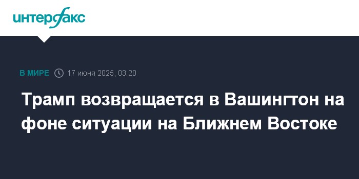 Москва. 17 июня. INTERFAX.RU - В связи с ситуацией на Ближнем Востоке президент США Дональд Трамп досрочно покидает проходящий в Канаде саммит "большой семерки" и возвращается в Вашингтон, сообщили в Белом доме.