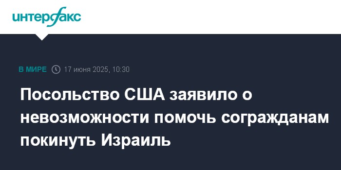 Москва. 17 июня. INTERFAX.RU - Посольство США в Израиле не может помочь американцам уехать из страны, сообщили в американском диппредставительстве.