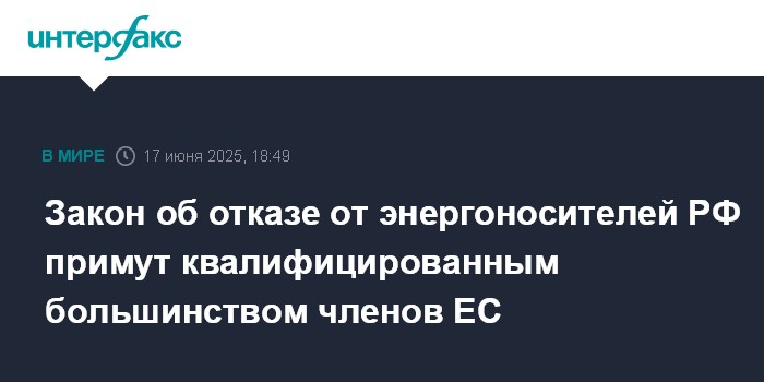 Москва. 17 июня. INTERFAX.RU - Подготовленный Еврокомиссией (ЕК) законопроект о поэтапном отказе ЕС от российских энергоносителей относится к числу законодательных актов, утверждаемых квалифицированным большинством в Совете ЕС, заявил член ЕК по энергетике Дан Йоргенсен.