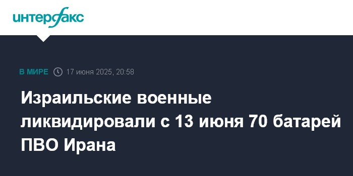 Москва. 17 июня. INTERFAX.RU - Израильские военные уничтожили с пятницы 70 иранских батарей ПВО, сообщает The Times of Israel со ссылкой на Армию обороны Израиля (ЦАХАЛ).