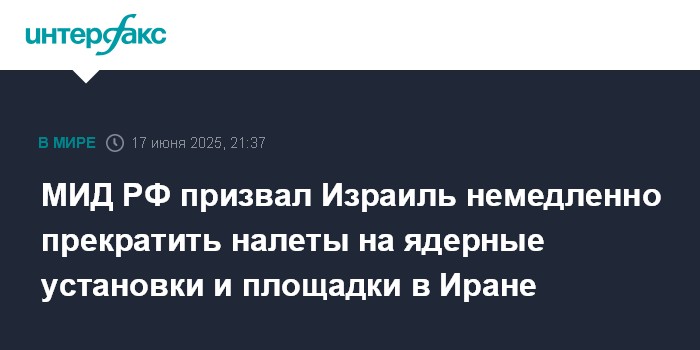 Москва. 17 июня. INTERFAX.RU - Атаки израильской стороны на ядерные установки и площадки в Иране толкают мир к ядерной катастрофе, Тегеран заявил о неизменной приверженности обязательствам по ДНЯО и готовности к возобновлению контактов с США при условии прекращения израильских нападений, сообщает МИД РФ.
