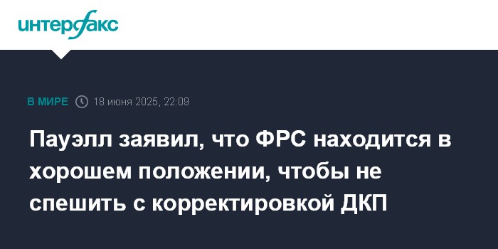 Москва. 18 июня. INTERFAX.RU - Федеральная резервная система (ФРС) США находится в хорошем положении, чтобы получить больше информации о вероятном курсе движения американской экономики, прежде чем рассматривать возможность корректировки денежно-кредитной политики (ДКП), заявил председатель Федрезерва Джером Пауэлл в ходе пресс-конференции по итогам завершившегося в среду двухдневного заседания.
