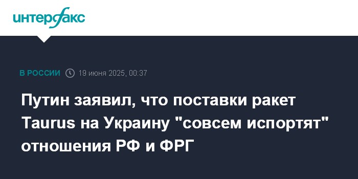 Москва. 19 июня. INTERFAX.RU - Возможные поставки Германией ракет Taurus Украине не повлияют на ход боевых действий, но еще больше испортят отношения Москвы и Берлина, заявил президент РФ Владимир Путин.