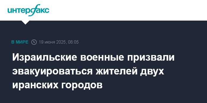 Москва. 19 июня. INTERFAX.RU - Армия обороны Израиля (ЦАХАЛ) призвала эвакуироваться жителей иранских городов Арак и Хондаб в связи планируемыми по ним ударами, сообщили израильские СМИ со ссылкой на публикацию в аккаунте ЦАХАЛ на фарси.