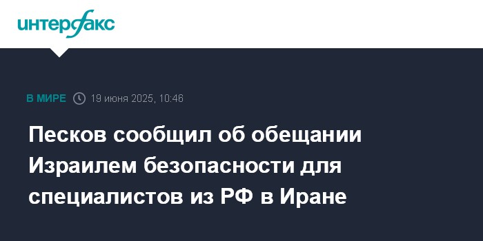 Москва. 19 июня. INTERFAX.RU - Израиль обещал России обеспечить безопасность ее специалистов, работающих в Иране на Бушерской АЭС, сообщил пресс-секретарь президента РФ Дмитрий Песков.
