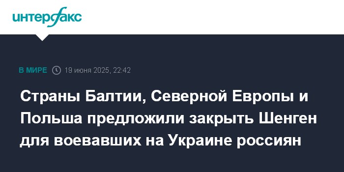 Москва. 19 июня. INTERFAX.RU - Министры внутренних дел стран Балтии, Северной Европы и Польши на встрече в четверг в Таллине высказались за блокирование доступа в Шенгенскую зону граждан России, воевавших на Украине.