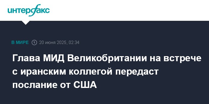 Москва. 20 июня. INTERFAX.RU - Глава МИД Великобритании Дэвид Лэмми на запланированных на пятницу переговорах в Женеве передаст иранскому коллеге Аббасу Аракчи послание от администрации США, передает Sky News.