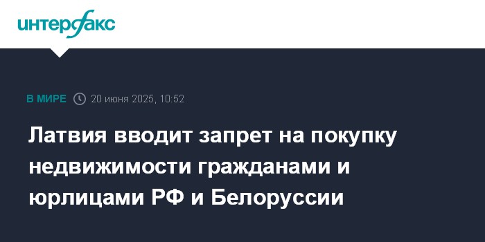 Москва. 20 июня. INTERFAX.RU - Сейм Латвии в окончательном чтении принял закон, запрещающий российским и белорусским юрлицам, а также гражданам этих стран приобретать недвижимость в республике, сообщила пресс-служба латвийского парламента.