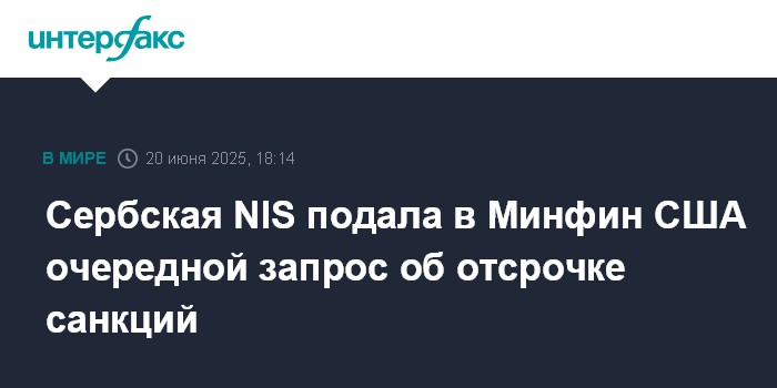 Москва. 20 июня. INTERFAX.RU - Сербская энергокомпания NIS (входит в "Газпром нефть") подала в Минфин США очередной запрос об отсрочке американских санкций, сообщается на сайте NIS.