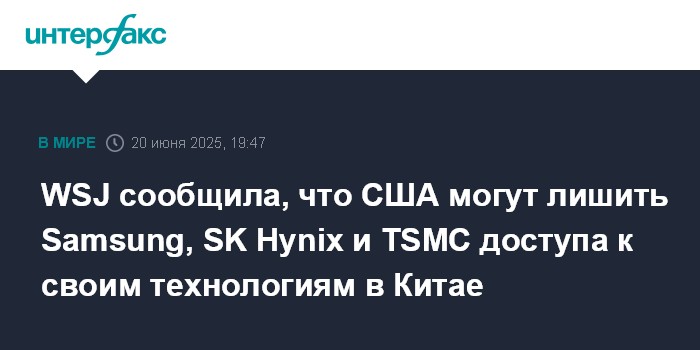 Москва. 20 июня. INTERFAX.RU - США хотят лишить южнокорейских чипмейкеров Samsung Electronics и SK Hynix, а также тайваньскую Taiwan Semiconductor Manufacturing Company (TSMC) доступа к американским технологиям в Китае. Об этом пишет The Wall Street Journal со ссылкой на информированные источники.