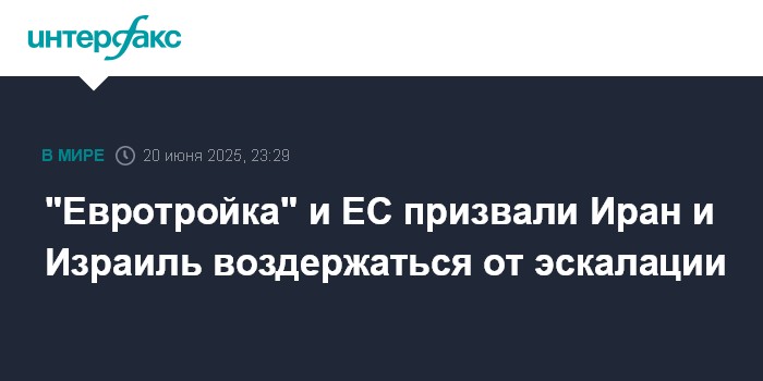 Москва. 20 июня. INTERFAX.RU - Министры иностранных дел Франции Жан-Ноэль Барро, Германии Йоханн Вадефуль и Великобритании Дэвид Лэмми и глава дипломатии ЕС Кая Каллас в совместном заявлении высказали серьезную обеспокоенность эскалацией напряженности на Ближнем Востоке.