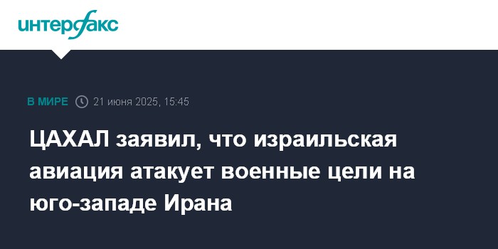 Москва. 21 июня. INTERFAX.RU - ВВС Израиля наносят удары в субботу по военным объектам на юго-западе Ирана, сообщает The Times of Israel со ссылкой на Армию обороны Израиля (ЦАХАЛ).