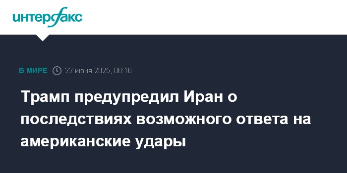 Москва. 22 июня. INTERFAX.RU - Президент США Дональд Трамп заявил, что любая попытка Ирана ответить на американские удары по иранским ядерным объектам приведет к более тяжелым последствиям.