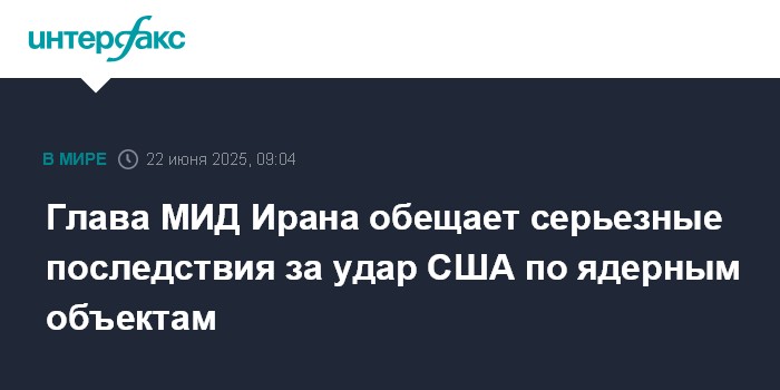 Глава МИД Ирана обещает серьезные последствия за удар США по ядерным объектам