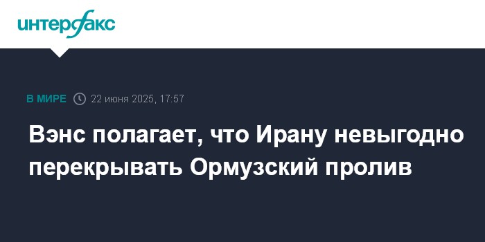 Москва. 22 июня. INTERFAX.RU - Иран столкнется с огромными экономическими трудностями, если решит перекрыть движение судов по Ормузскому проливу, заявил в воскресенье вице-президент США Джей Ди Вэнс.