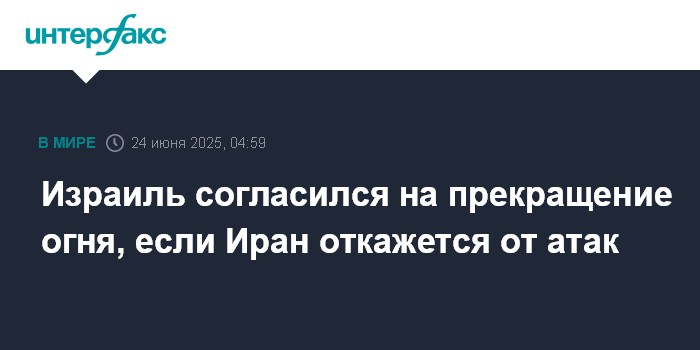Москва. 24 июня. INTERFAX.RU - Израиль согласился на прекращение огня с Ираном при условии, что Тегеран откажется от ударов по Израилю, сообщает CNN со ссылкой на представителя Белого дома.