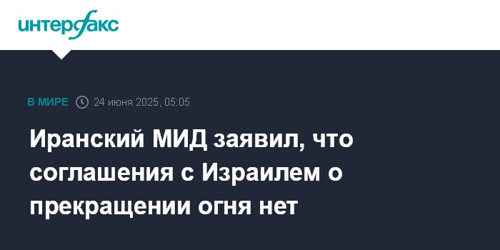Москва. 24 июня. INTERFAX.RU - Министр иностранных дел Ирана Аббас Аракчи заявил, что на данный момент нет соглашения с Израилем о прекращении огня.