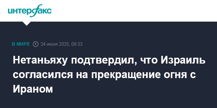 Москва. 24 июня. INTERFAX.RU - Премьер-министр Израиля Биньямин Нетаньяху во вторник заявил, что его страна согласна на прекращение огня с Ираном, сообщает Associated Press.