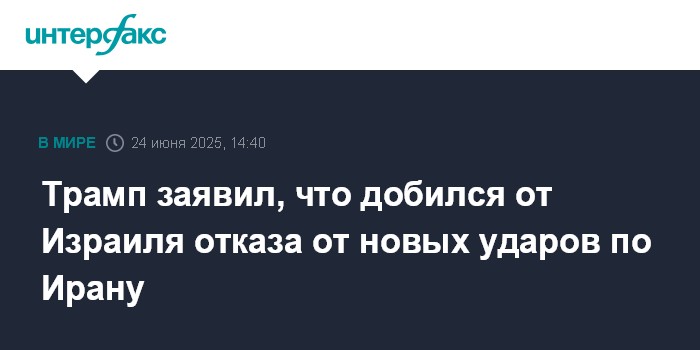 Москва. 24 июня. INTERFAX.RU - Израиль согласился отменить запланированные удары по Ирану, перемирие между сторонами конфликта остается в силе, заявил во вторник президент США Дональд Трамп.