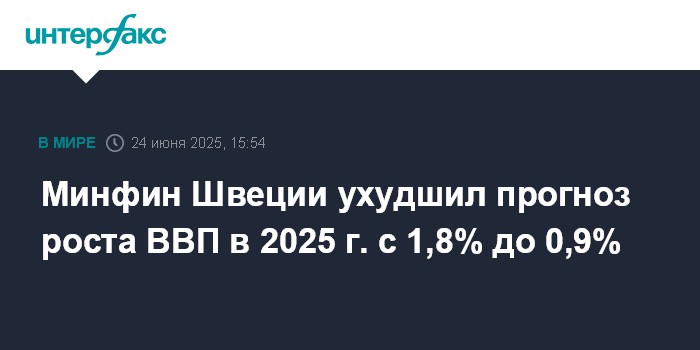 Москва. 24 июня. INTERFAX.RU - Министерство финансов Швеции резко ухудшило экономический прогноз на текущий год, во второй раз за последние три месяца, сославшись на более слабые перспективы роста потребления и риски, связанные с торговой политикой США.
