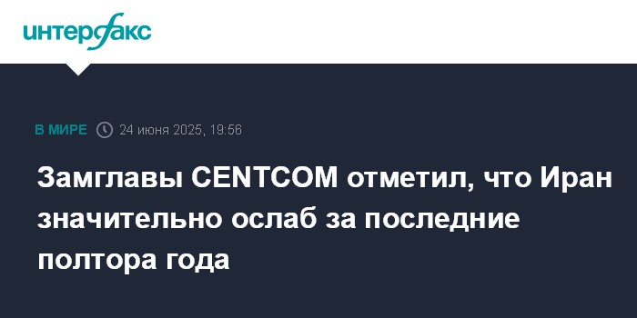 Москва. 24 июня. INTERFAX.RU - Иран значительно ослаб в ходе событий на Ближнем Востоке, которые последовали после нападения группировки ХАМАС на Израиль 7 октября 2023 года, и это играет на руку США, заявил заместитель командующего Центральным командованием ВС США (CENTCOM) вице-адмирал Брэд Купер.