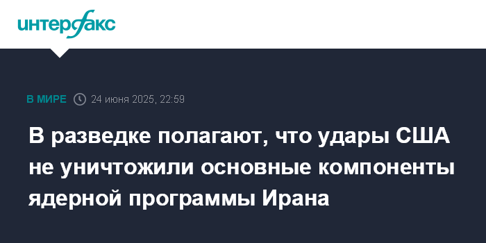 Москва. 24 июня. INTERFAX.RU - Предварительная оценка разведывательного управления Минобороны США показывает, что американские удары по Ирану не смогли ликвидировать основы иранской ядерной программы, сообщает во вторник CNN со ссылкой на источники.