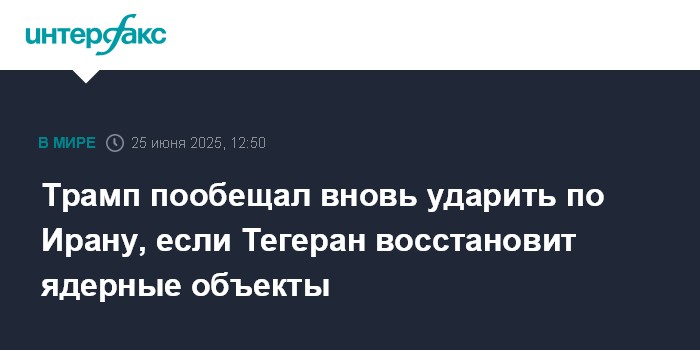 Накануне Трамп заявил, что "Иран никогда не восстановит свои ядерные объекты". Ранее он сообщал, что нанесенные в ночь на 22 июня американские удары привели к полному уничтожению иранских ядерных объектов в Натанзе, Фордо и Исфахане.