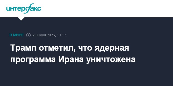 Москва. 25 июня. INTERFAX.RU - После ударов США по ядерным объектам Ирана ядерная программа страны уничтожена, заявил президент США Дональд Трамп.