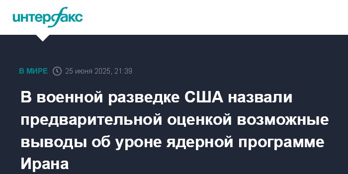 Москва. 25 июня. INTERFAX.RU - Выводы разведки США о недостаточном уроне ядерной программе Ирана, которые попали в американские СМИ, являются первоначальными и неполными, сообщает в среду "Аль-Арабийя" со ссылкой на неназванного представителя разведывательного управления Минобороны Соединенных Штатов.