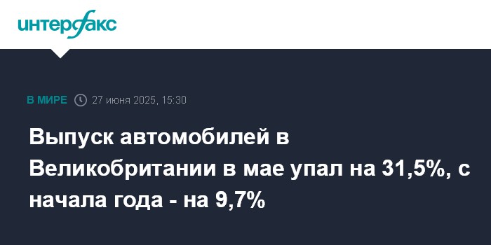 Москва. 27 июня. INTERFAX.RU - Производство легковых автомобилей в Великобритании в мае рухнуло на 31,5% относительно того же месяца прошлого года - до 47,723 тыс. Об этом говорится в сообщении Общества производителей и продавцов автомобилей (SMMT).