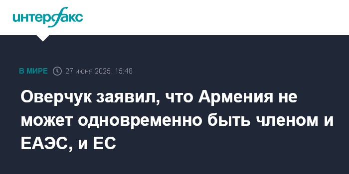Москва. 27 июня. INTERFAX.RU - Одновременное членство Армении в ЕС и ЕАЭС невозможно, но Россия будет уважать выбор этой страны, заявил вице-премьер РФ Алексей Оверчук.