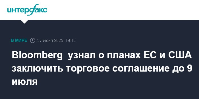 Москва. 27 июня. INTERFAX.RU -В ЕС и США полагают, что им удастся добиться торгового соглашения в той или иной форме до 9 июля, когда истекает срок, отведенный Вашингтоном на соответствующие переговоры, передает в пятницу Bloomberg со ссылкой на источники.