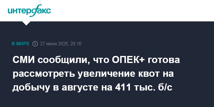 Москва. 27 июня. INTERFAX.RU - "Восьмерка" стран-добровольцев ОПЕК+ готова 6 июля рассмотреть возможность очередного наращивания квот на добычу на 411 тыс. баррелей в сутки, пишут иностранные СМИ со ссылкой на делегатов.